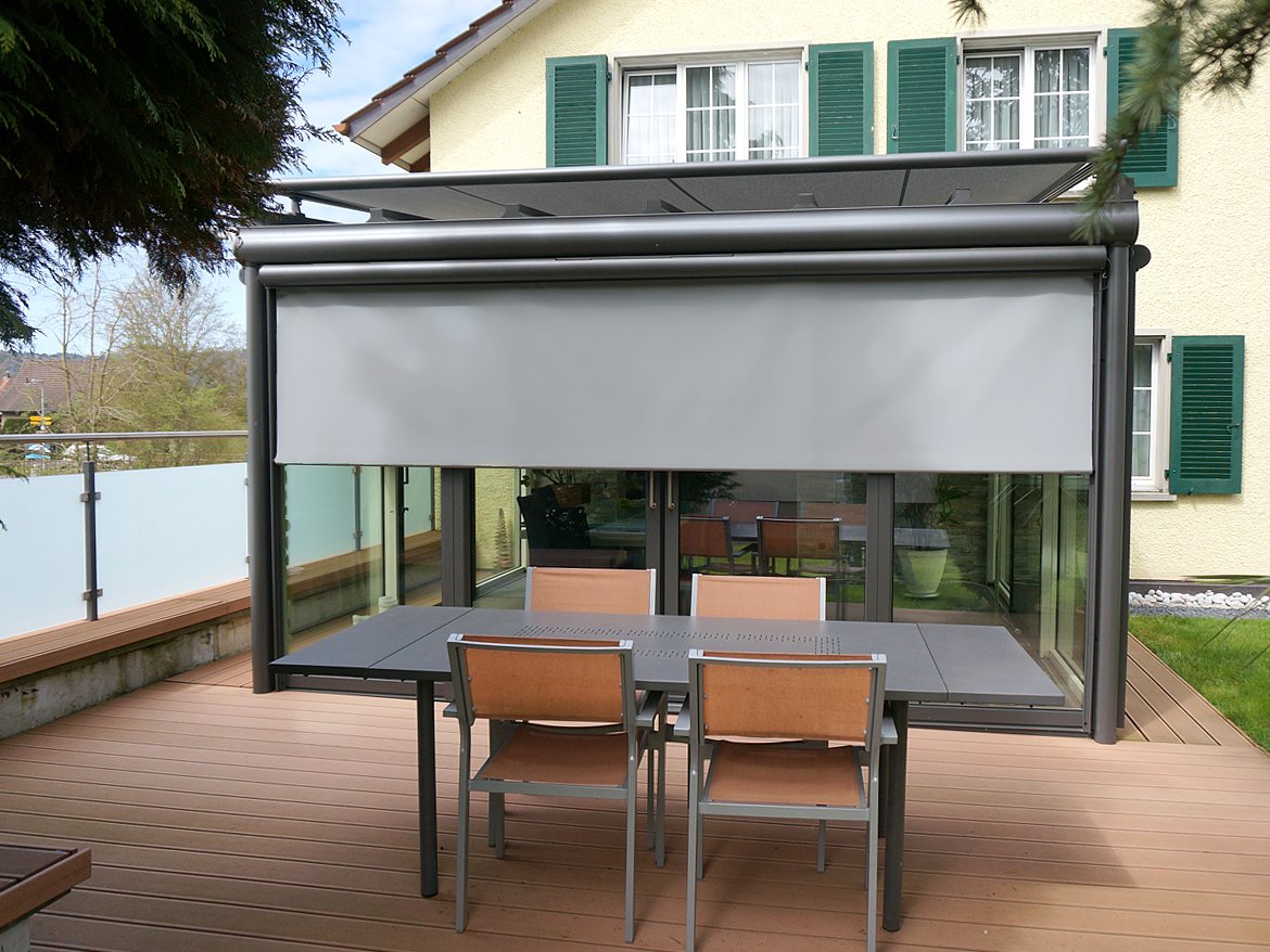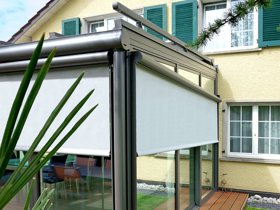 Senkrechtmarkise: universeller Blend-, Sicht- und Hitzeschutz mit halbrundem Schutzkasten