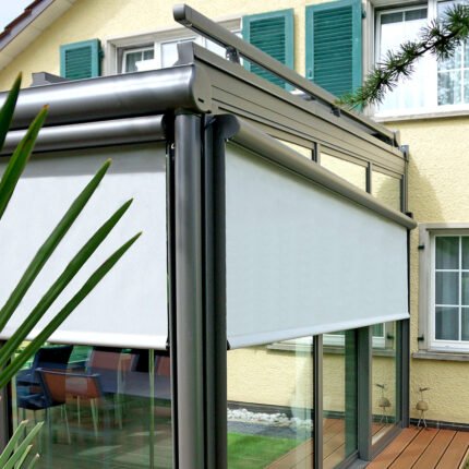 Senkrechtmarkisen schützen vertikal vor tiefer Sonne, Wind und unerwünschten Blicken: